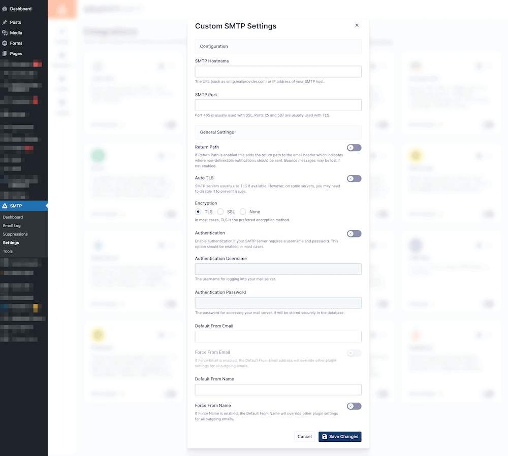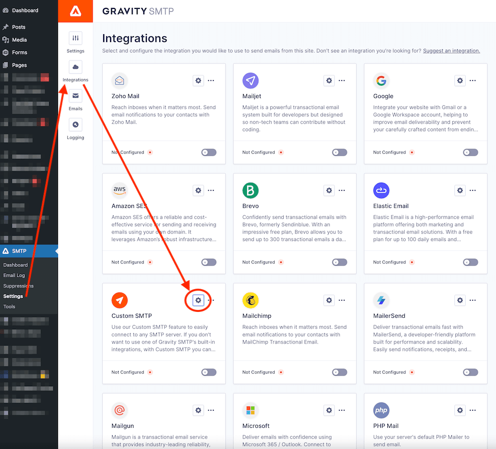 2. Login to your WordPress site using your own admin username / password (please let us know if you don’t have these details and we will help you gain access) then go to SMTP > Settings > Integrations and click the cog icon for Custom SMTP: