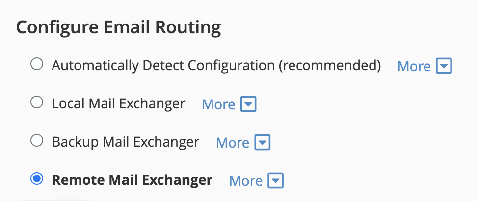The next thing to check should be your Email Routing configuration in cPanel – in general you should select the Remote Mail Exchanger option. However if you are hosting your business email in the same hosting account as your website, then you should select the Local Mail Exchanger option.
